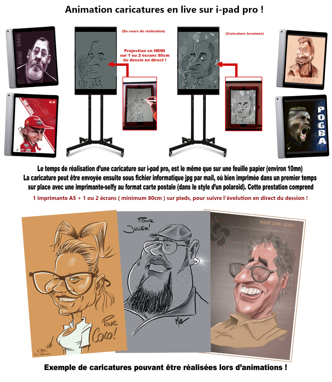 1 ou 2 écrans 80cm pour diffusion du dessin en live sont fournis par l'artiste.